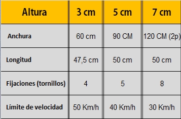 Tres tipos, con tres alturas para reducir la velocidad a menos de 50 km/h, a menos de 40 km/h y a menos de 30 km/h.